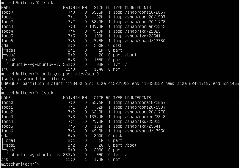 $ sudo resize2fs /dev/mapper/ubuntu--vg-ubuntu--lv