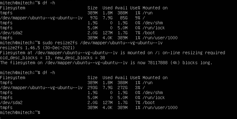 $ sudo resize2fs /dev/mapper/ubuntu--vg-ubuntu--lv