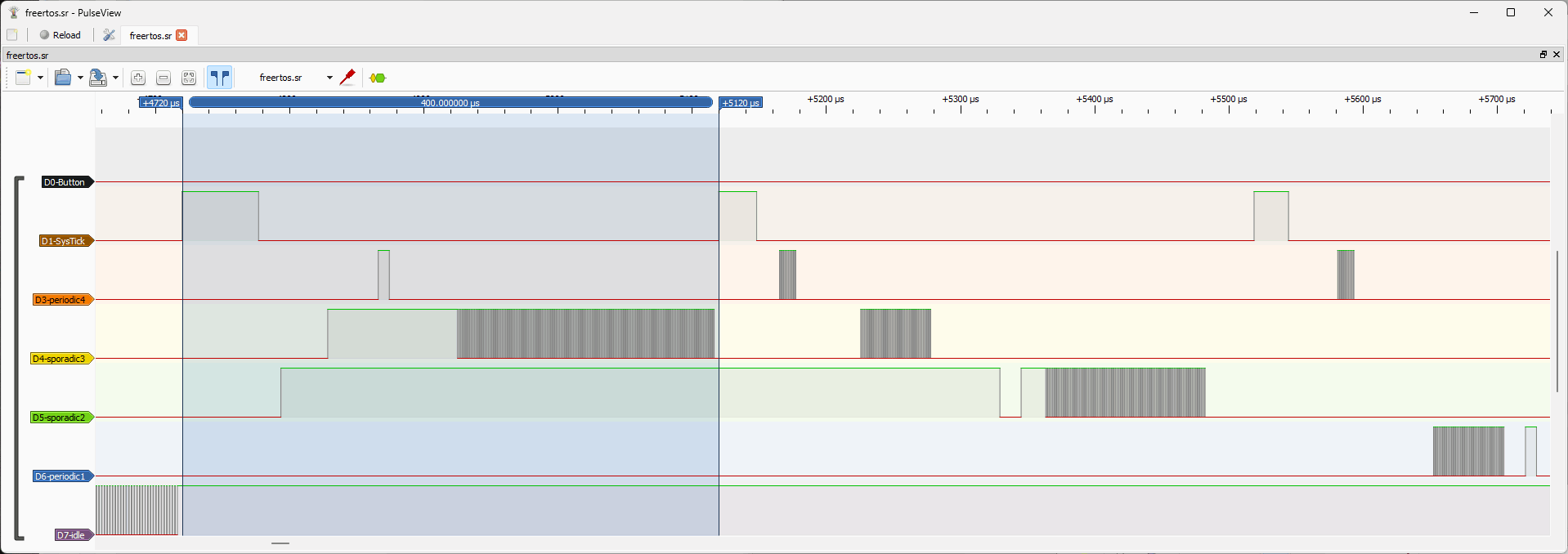 Logic analyzer trace after pressing the button (preemptive FreeRTOS kernel)