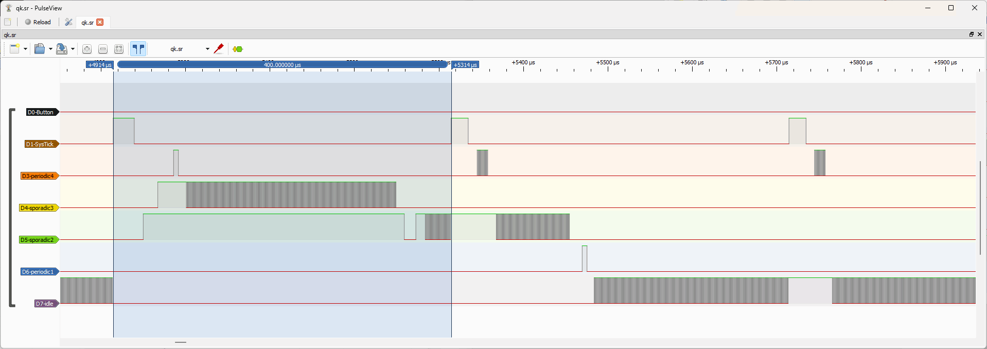 Logic analyzer trace after pressing the button (preemptive QK kernel)